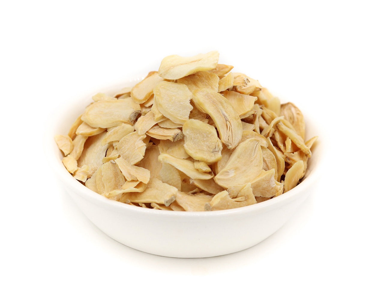 Láminas de ajo deshidratadas, ideales para aportar sabor y textura en salteados, sopas o decoraciones de platos.